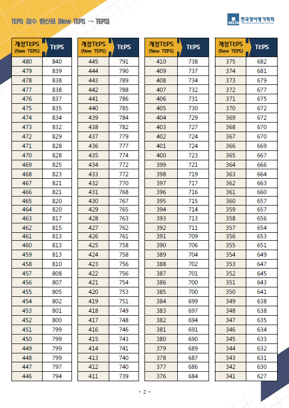 뉴텝스(New TEPS) 점수 환산 테이블